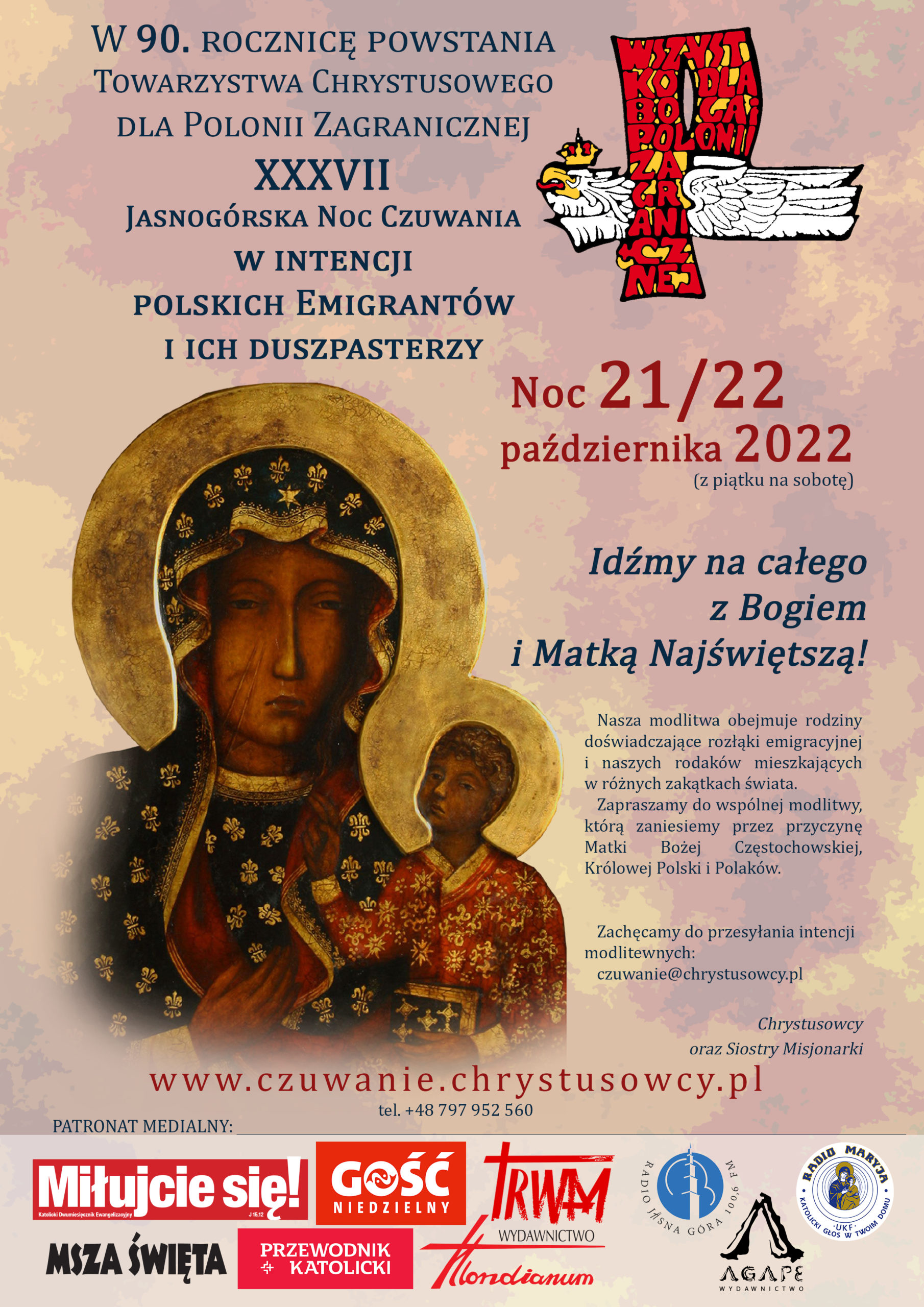 W nocy 21/22 października 2022 r. odbędzie się coroczne czuwanie modlitewne w intencji Polonii zagranicznej i ich duszpasterzy, organizowane przez Towarzystwo Chrystusowe dla Polonii Zagranicznej i Siostry Misjonarki Chrystusa Króla.